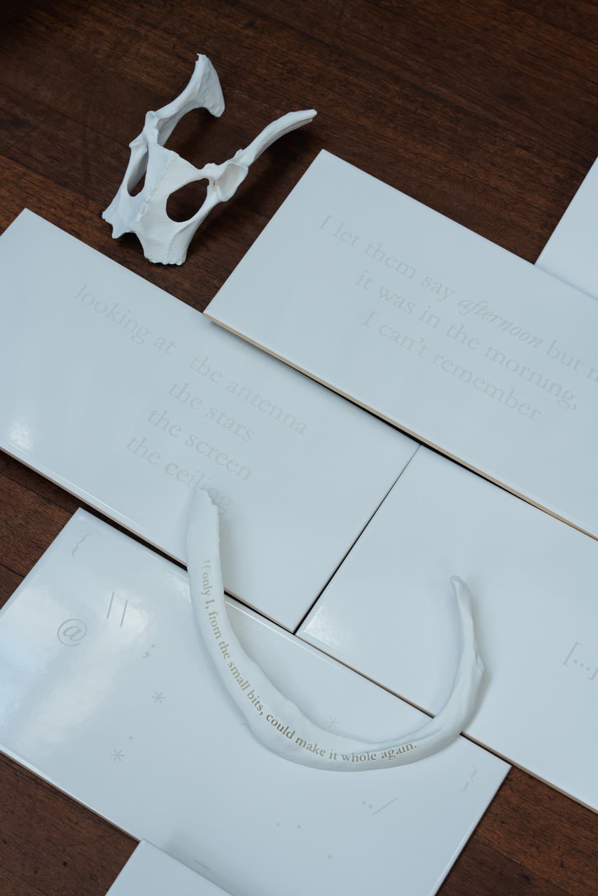 "Show me a sunny afternoon” is an installation activated through a sound-based performance. It explores the interplay between memory, data, and digital materiality, opening a space to question the boundaries between the algorithmic and the intimate. This space embraces contradiction and the ineffable. Generated sounds merge with voice, while algorithmic texts are engraved in negative into physical matter.