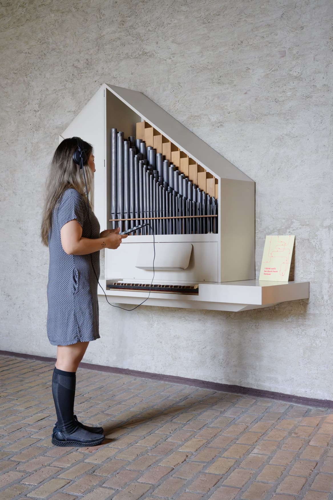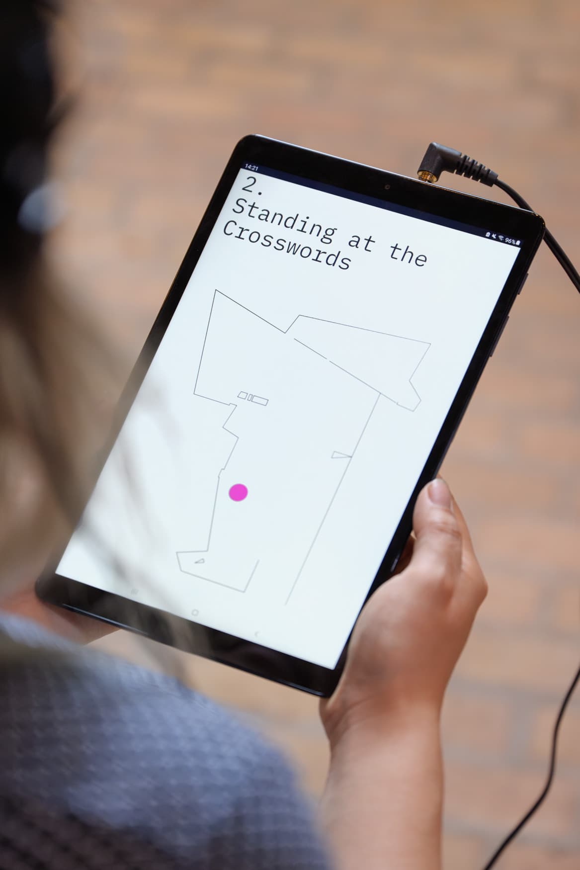 A tool in the shoe. A rhythmic looking around. A mandatory break. A strategy that went wrong. A prediction out of control. A voice out of tune. A thing in the throat. Ahem […] An unexpected suspension. A tension. A flip. A flop. A plan for nothing. An elevator for nothing. A disappointed stare. A buildup in the mouth. An attachment, taking over. A guideline for sticking while unsticking. An earwax flow. A zigzag brick. A chit-chat of adjustments. An attempt to find a tape that can glue all these things together. Tell me if you find such a tape. Otherwise, this whole project will fall to the ground. Made of a three-fold articulation of sound, text, and image, the work is a composition in space, told in fragments, that invites the listener to take part in its construction by walking around the space, looking for specific spots to listen, marked on a map.