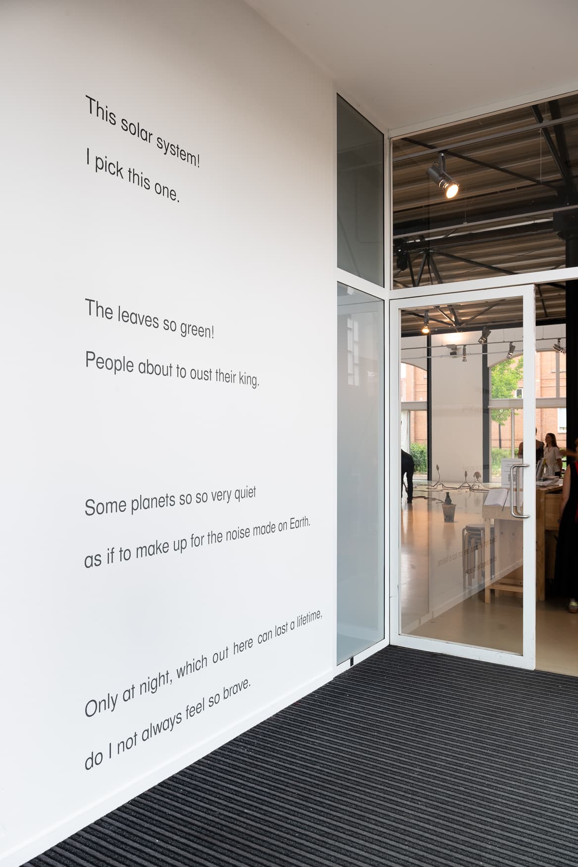 'As if to Make Up for the Noise Made on Earth' is a poetic invitation consisting of fragments of texts pasted on walls and windows, rolled out on banners and hidden in codes. It questions whether anything really changes but asserts that a different world is possible nonetheless. Employing street tactics of (is)lands that are neither this or that, it encourages visitors to engage in a type of time-traveling that for those descending from occupation and abduction is a matter of everyday life. This solar system is speaking to you, even if you aren't listening. It tells of unspeakable things carried in its oceans and winds. An ancient planet is believed to be dying, but we are the only ones running out of time. The problem is that this 'we' is not a monolith, but always dependent on the creation and subsequent targeting of the racialized. The regime creates its counterpart and then tries to get rid of it. But you are proof that this strategy will never fully succeed. Your ancestors were engineered to prevent a revolution, but now you are part of one. Echoes of squatted buildings and anti-imperialist leaders live on beyond their eviction and assassination. So let's drift off to songs inherited. Let's listen to the many quiet moons that remain happily out of reach. Let's crawl into the solar eclipse and let it transport you to another time, another place. Can you see them? Can you hear them? The ones who were not where they were supposed to be?