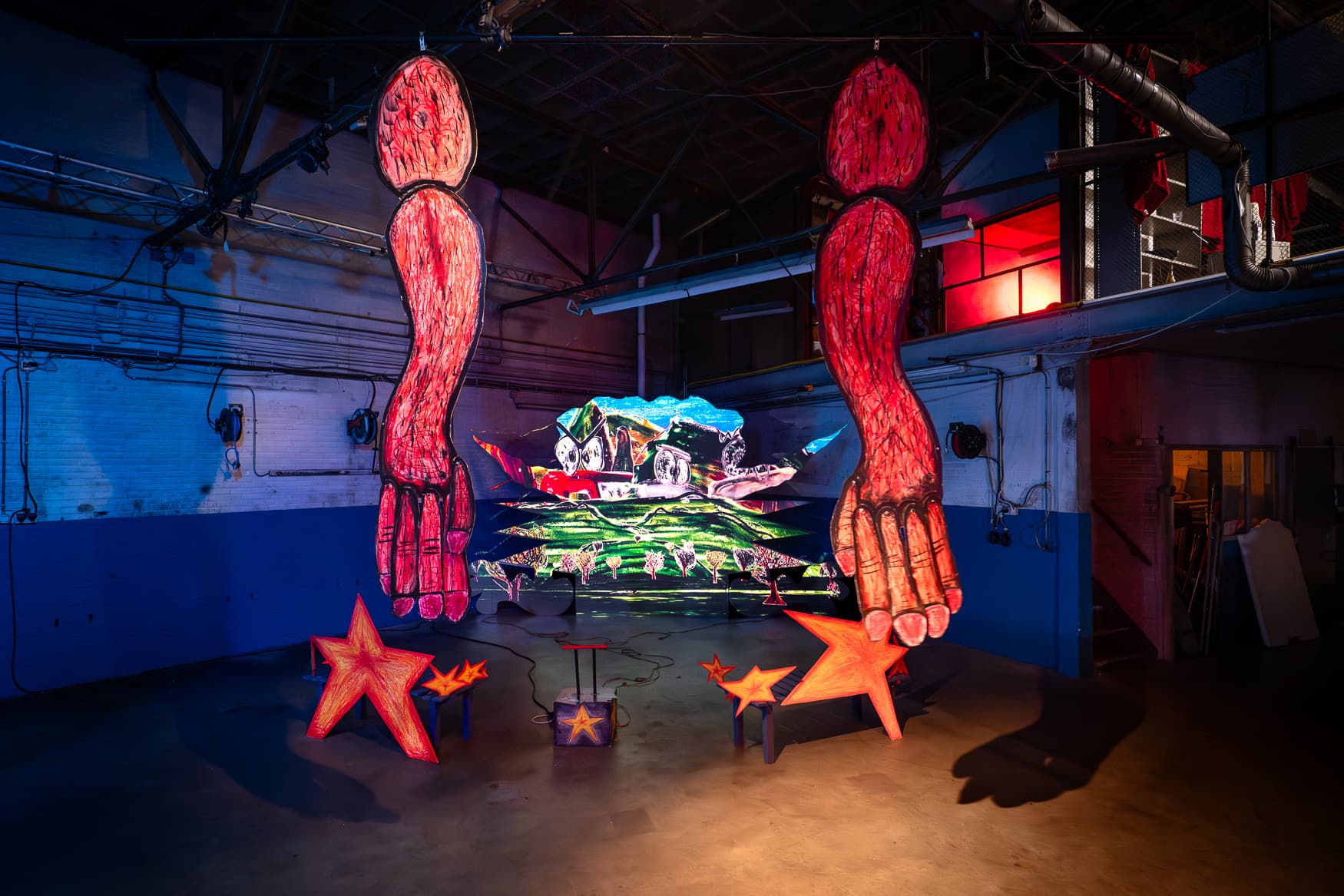 FORBIDDEN FRUITS TASTE BETTER is a queer altar to the impossible, a regenerating origin story where identity and belief are perpetually rewritten. Reappropriating religious storytelling, it rephrases the exclusionary biblical origin myth into an inclusive space where the deeply personal and universally dissonant cohabitate. Large sculpted hands reach out, seducing viewers inward, while a glowing star bench offers a place to linger. The installation functions as one breathing entity—a sensory theatre of bodies, lights, and unspoken codes—inviting the viewer into a choreography between moving image and physical matter, where beginnings are not fixed, but fluid and open to transformation.