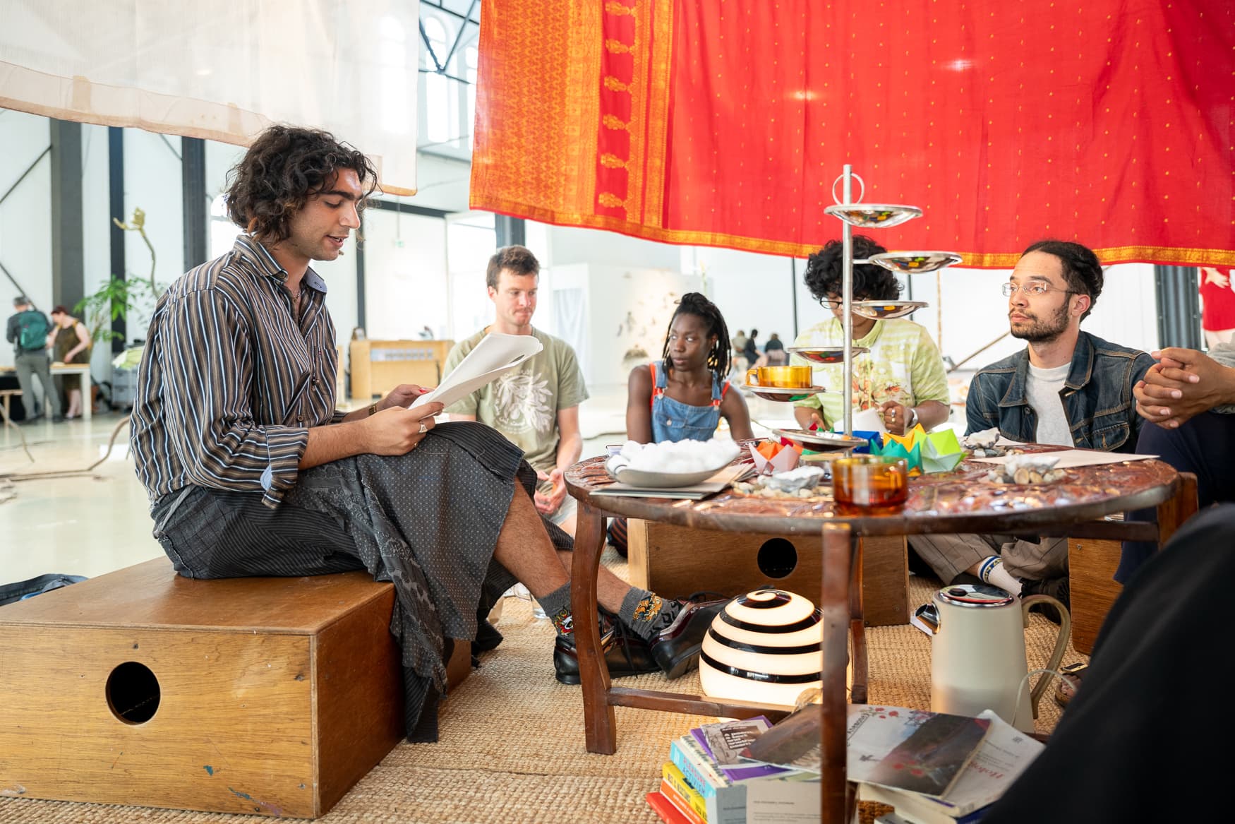 Gesturing towards survival as an ongoingness of presence - as an experiment in imagining otherwise - as a necessary giving in to what is - as a commitment to kinship in all forms - as a discipline of hope against hope - as a practice of showing up. As an artist, researcher, writer, and facilitator interested in the concepts of space and place-making, this work is an experiment in holding space. designed as a physical manifestation of the artist’s vision of a space of connection and intention, the work opens possibilities of an otherwise that feels almost within reach but somehow net yet. The artist combines their developing practice of installation, safe(r) space facilitation, storytelling, performance, mixology, and herbalism to bring together notions of healing justice, land stewardship, mutual aid, grief tending more-than-human kinship, queer & trans rituals of care in this dream-incarnate space. A large installation resembling a 3-dimensional upside-down spiral constructed out of metal hosts 6 saris draped over the structure. The saris are heirlooms inherited by the artist from their mother and grandmother. This interactive installation serves as an opportunity to create a sense of retreat and separation from the larger exhibition hall without leaning into opacity. within this construction lies a sitting room which the artist hosts. At its core, this installation raises a mirror to the popularity of safe and safe(r) spaces in Amsterdam and the violence of uncritical linearity. By essentially building what is to them, a safe(r) space, the artist asks, can a space be at once safe and critical? is safety all we are looking for? and what might then we envision instead? combining Bruno Labour’s theorisation of critical zones and Kristi Clemens and Dr. Brian Arao’s concept of brave space, the artist intends to highlight the vital role of courage in the acknowledgement and subsequent learning about, of the intricate webs of othering we are entangled in. In this space, the artist uses the tools of storytelling and performance as they host a drawn-out tea ceremony using teas from their once home country of India and tisanes foraged from their now home of Amsterdam. This experiment in holding space is simultaneously an experiment in decolonising learnt notions of hospitality, generosity, reciprocity, and vulnerability so that we may be braver and build more robust spaces of relational solidarity and accountability.