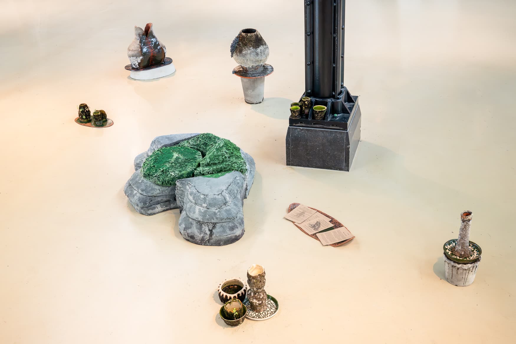 Elegy to the Frogs is a multimedia installation that engages with the violent reconfiguration of anuran amphibian bodies,*coerced into transformation by endocrine-disrupting pollutants like Atrazine and glyphosate (Roundup)—agricultural chemicals still widespread across Europe. This ecological corruption opens a broader inquiry into swamp pedagogies—ways of thinking, learning, and becoming with wetlands, bogs, and other liminal ecosystems—spaces persistently drained and erased under the extractive imperatives of capitalist growth and development. Various vessels, shaped like queered anuran vocal sacs, invoke the echoes of voices lost to high concentration of agro-pharmaceuticals in their environments. Each vessel enters into a symbiotic relationship with a bryophyte (moss), foraged from the places I call home, carrying with it the hope that these plants might unlock their latent phytoremediation capacity (the ability of plants to remove or neutralize pollutants from the environment). Here, bryophytes and Anura conspire, entangling us in imagining futures where more-than-human ecologies accumulate and absorb the toxic pollutants of our swamps, conjuring the return of frogs, singing once more. A choir emerges from the installation. Queer voices assemble, offering their crepuscular tunes as a call of solidarity with the disappearing amphibians, beseeching empathy from all the silenced bodies of the West. Speculating about a future of nights—mute, silent, rid of frog choirs—queering voices cast a spell, calling on the resilience and survival strategies of the wetlands: indeterminacy, mutation, hybridisation, symbiosis, and sympoiesis. With our bodies remade by the posions of our time. Lend your queer kin your ears. *Frogs are amphibians of the order Anura (without a tail).