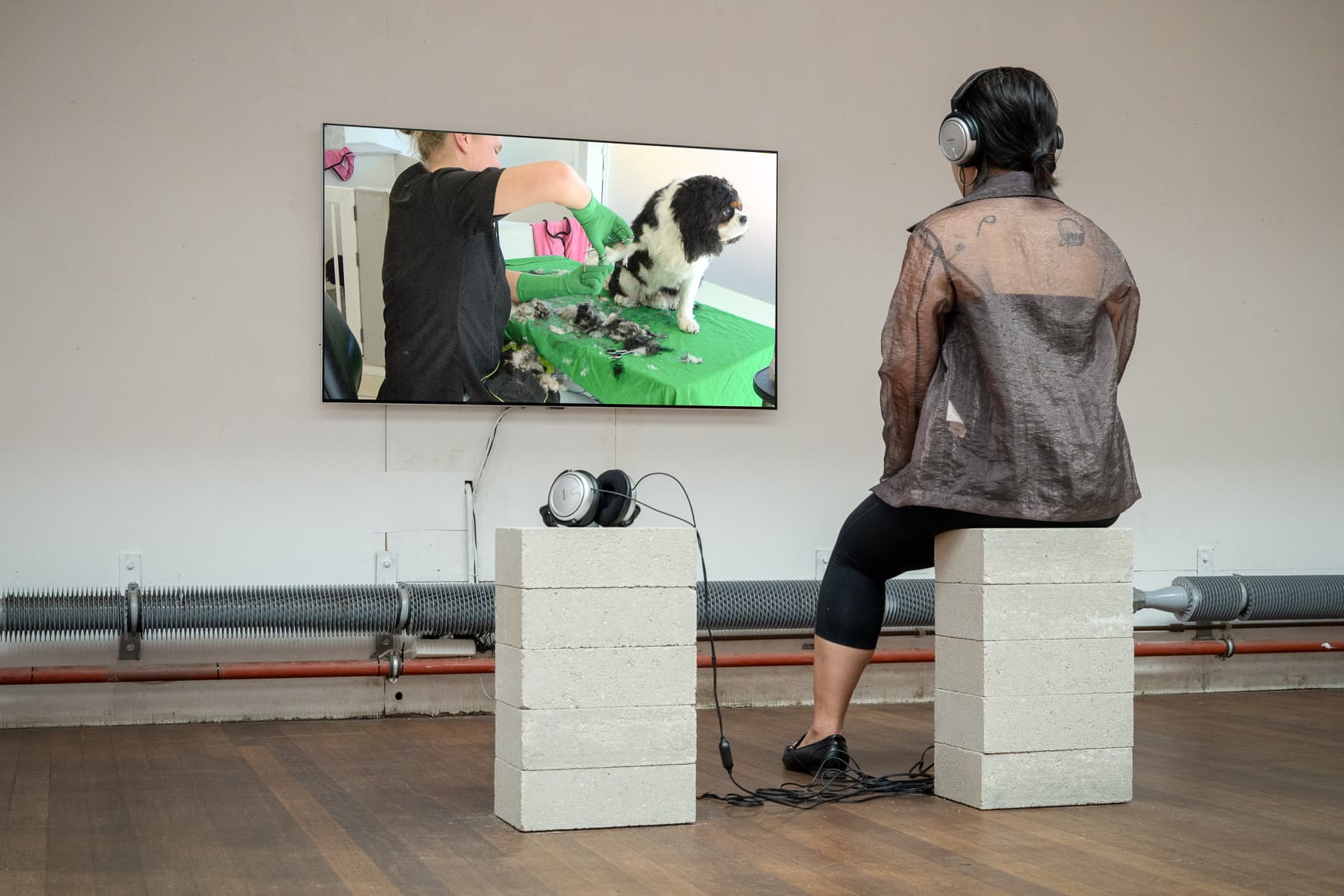 In the road movie 'Charlie got a new cut' the question ‘who is Charlie?’ is not so important. It could be a colleague, a client, a dog or yourself. Based on the filmmaker's own experiences, the journey travels through different Dutch working environments in which the scripted and unscripted interactions between bodies, tools, and spaces are explored. The towels of the sauna master unfold the road. The scissors of the groomer take the (short)-cuts. And the civil servant’s coffee keeps the vehicle running. Green Screen leads the way in many different material forms.
