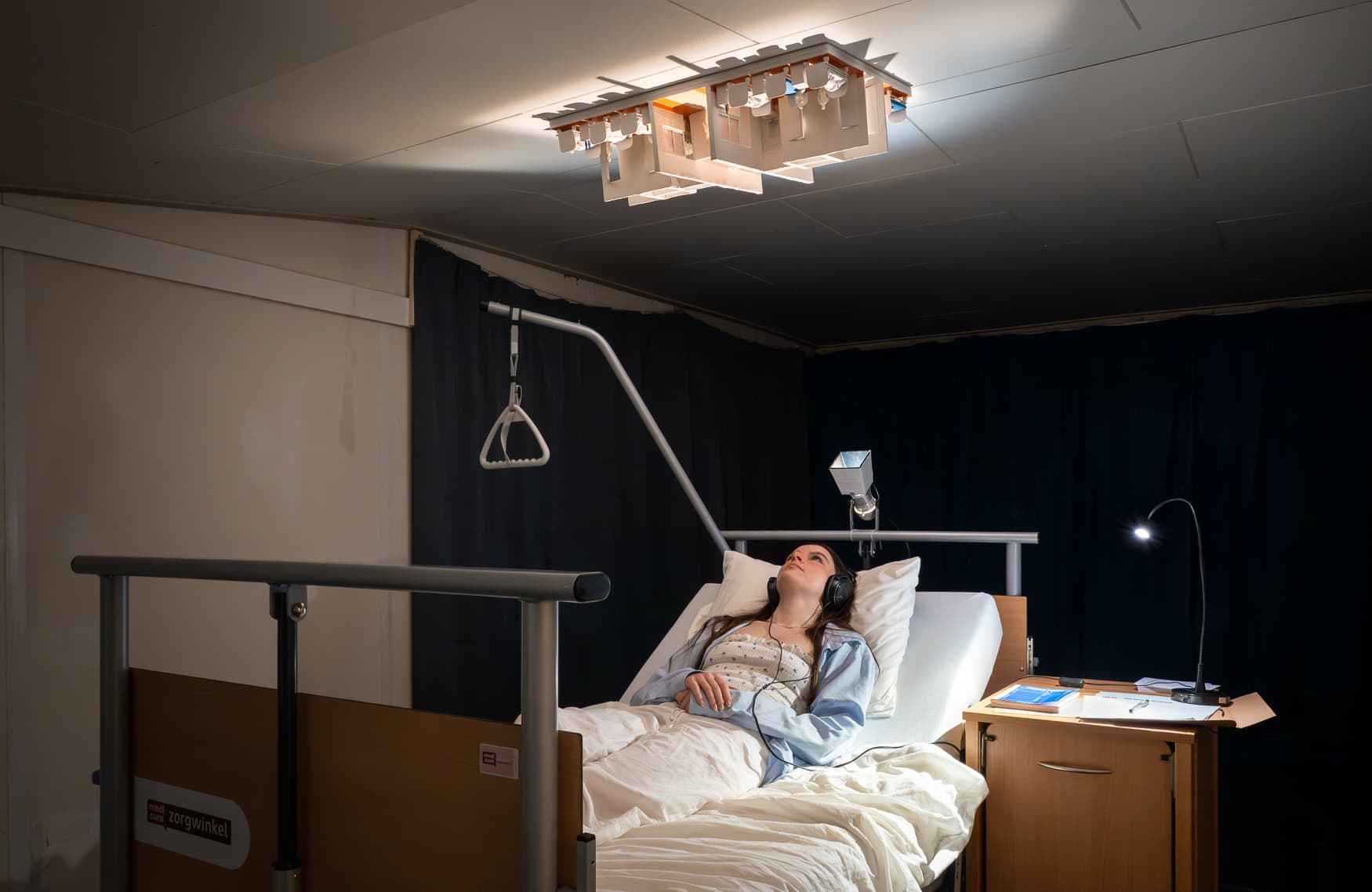 As I lie in bed, listening to the orchestra of hospital sounds, I have an existential crisis. The fridge in the hallway is vibrating against the tiled wall. Two people are snoring, almost at the same time. Ambulances come in every few minutes. Someone is watching How I Met Your Mother. Something is buzzing. The sink faucet drips from time to time. I can’t seem to figure out why I actually came here anymore. I am alone in a hospital bed with only a plastic bag filled with my belongings, a stranger is sleeping 70 centimeters away from me, and I can’t help but think of how miserable I feel. Why am I here? No one actively takes care of me, and I am way more uncomfortable than I was at home. I feel lonely and confused, not really able to process why this whole experience that is supposed to help (in my mind at least) makes me feel so much worse. Being sick is so inherently stressful, how did I think I would immediately adapt to this whole situation? “Sterile white walls” — anyone would immediately think of a hospital room. “Hospital lights” — the white fluorescent lights everyone hates. “Hospital bed” — every time there’s a metal frame bed that’s slightly uncomfortable. Hospital rooms (and hospitals in general) have the reputation of being notoriously ugly, uncomfortable, and unwelcoming. As clinical efficiency has taken over patient-centered care, the hospital has turned into a techno-utopia, and care has turned into cure. Healing rooms is an exploration of patient rooms as an active component of healing. From the perspective of the patient, inviting visitors to experience the patient room as a space of vulnerability, routine disruption, and sensory overload. Hospital rooms—and hospitals in general—are often perceived as notoriously ugly, uncomfortable, and unwelcoming. As clinical efficiency has overtaken patient-centered care, the hospital has turned into a techno-utopia where care has been reduced to cure. Healing Rooms is an exploration of the patient room as an active component of healing. Approached from the perspective of the patient, the project invites visitors to experience the hospital room as a space of vulnerability, routine disruption, and sensory overload.