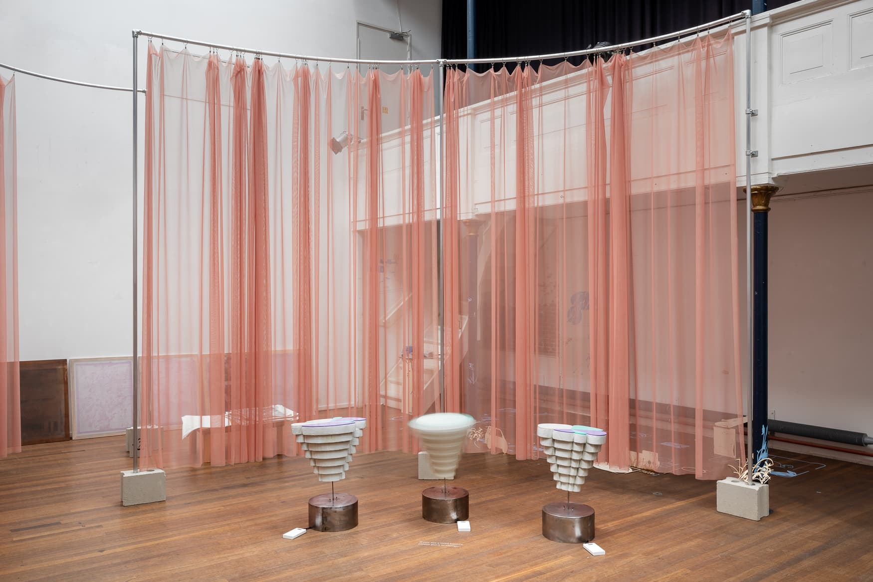 Three spinning bodies, fragmented choreographies, each powered by its own lithium battery. Their rotations diverge in rhythm and duration. As the objects spin, they act as temporary vessels, their motion shaped by their limit. They perform, they slow, they pause. Over time, batteries weaken, requiring intervention—replacement, recharging, attention—echoing the chemistry, medicine, and metaphor of lithium itself. The work emerges from a broader research into lithium, not only as a chemical element or a psychiatric medication, but as a lens on the tension between depletion and productivity. The quiet circuit of care and maintenance in this work mirrors the unsustainable demands placed on bodies living in a high-performance society. Within this fragile loop of movement and breakdown, the installation questions the societal imperative to stay functional, to be always on, and asks, ‘What happens when we can no longer recharge?’