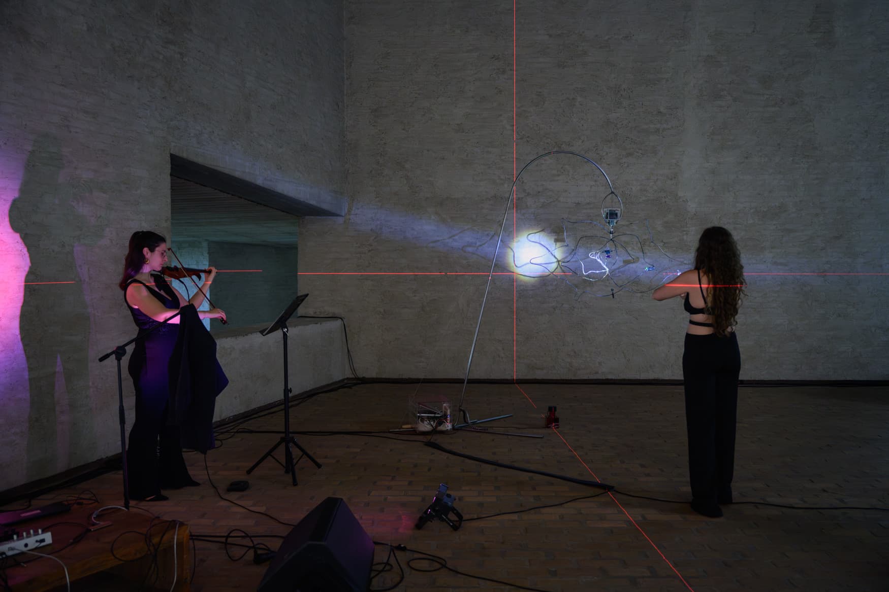 "Nothing in nature repeats identically. Every instance of movement and each instance of change, from the tiniest vibrations to the largest collisions, are in essence unrepeatable. Randomness is omnipresent in the occurrence of phenomena that just happen, each time in a new(born) version."* Randomness is that "spark of the real", to which, as humans, we are sensitive too. During the two years research Master's at Sandberg Institute, Giada worked using technological artefacts, scientific concepts and tools within a research guided by coincidences, resonances and intuition, therefore outside of a scientific method. The artistic practice is built out of gestures of re-appropriation of those material attunements that stand at the core of her research, present and past. Laser light, glass, sensors and data. Thirteen LDR sensors are arranged on a two-dimensional sculpture shaped to capture an instant of the diffraction pattern of laser light through bubbling glass (Prince Rupert drop). The sensors capture light waves and light variation, transforming the light in an electron flow. The variations, captured digitally into data are transferred via internet communication and transformed by a classical computer to render a movement. The quantum feature is there to create an unpredictable, in fact non-deterministic reaction to the visitor presence, introducing the true randomness at the core of nature's heart, captured at the nanoscale and expanded to a perceptual, macroscopic, dimension. Even though the communication to the quantum machine happens via the internet (and it is discontinued by technical queues), connecting to a distant machine, it is one of the most direct ways to experience the atomic world at the foundation of all matter. The 13 here is nothing but a magic number, a resonating reference to "13 blues for 13 moons", A Silver Mt. Zion album from 2008. This album and other works from artists such as Jessica Moss, Laurie Anderson and Peter Gregson are inspiring the drone notes from the violin composition in dialogue with the installation during its performative activation. For the performative act, the light-dependent installation transforms itself into an instrument, which interacts with the violin and modifies her sounds in an unpredictable fashion, dependent on performative gestures in conversation with immersive light patterns. The sounds are played by and with the light. The coherent notes of the violin strings, perfect harmonic oscillators, are dispersed in a sea of noise created with and by the visitors of the show during the three days at Thomaskerk. The composition that emerges carries the element of improvisation and "unfinished" quality**, unveiling randomness across domains of mater, culture and affect. With Delia La Gala at the violin, the sisters duo is united beyond distance and time. * Giada La Gala, Neuromagma. Sandberg Institute 2025. Thesis dissertation. ** "The unfinished is the magical halo that triggers associations and emotions that belong to a sphere superior to reason". From E. Battisti, Magia e Non Finito, in E. Battisti (ed.), Michelangelo Scultore, Rome, Curcio Editore, 1964, pp. 96–7.
