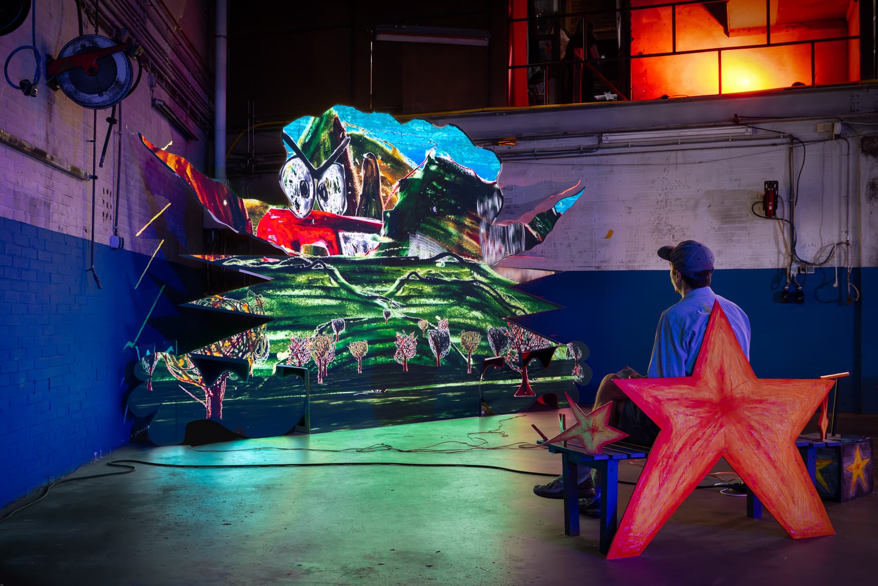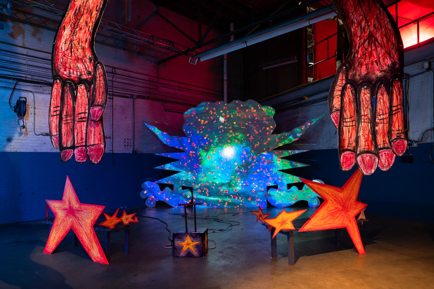 FORBIDDEN FRUITS TASTE BETTER is a queer altar to the impossible, a regenerating origin story where identity and belief are perpetually rewritten. Reappropriating religious storytelling, it rephrases the exclusionary biblical origin myth into an inclusive space where the deeply personal and universally dissonant cohabitate. Large sculpted hands reach out, seducing viewers inward, while a glowing star bench offers a place to linger. The installation functions as one breathing entity—a sensory theatre of bodies, lights, and unspoken codes—inviting the viewer into a choreography between moving image and physical matter, where beginnings are not fixed, but fluid and open to transformation.
