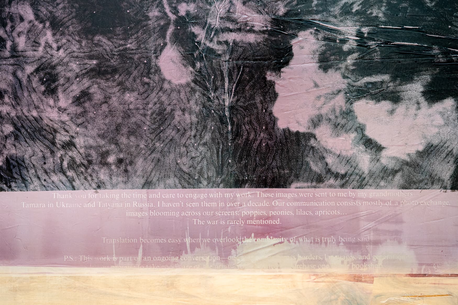 Finding a way to communicate across borders means acknowledging that borders themselves will reshape what is said. They will drink from the dew, And be warmed by the sun. traces a quiet, ongoing exchange between the artist and her two grandmothers—one in Ukraine, one in Russia—who have been sending her photographs of their gardens since February 2022. The war is rarely mentioned. Instead, flowers bloom quietly across the screen: jasmine, peonies, apricot blossoms, lilac… Working primarily with screen printing, Gorokhova embraces the imperfections and inconsistencies of the medium, which mirror the nature of translation—not only between languages, but between generations, geographic distances, and political realities. Each print becomes a fragment of lives lived in parallel, connected by images, memories, and traces of what remains unspoken. Materializing a fragile sense of closeness, they become translations themselves—partial, unstable, and open to new interpretation by the viewer. What fades or misaligns is as significant as what appears clearly. The atrocities of Russia’s war against Ukraine haunt every image that is sent. How can one address such violence without turning it into spectacle? Gorokhova weaves personal memory and inherited silence into a meditation on distance, desire, and representation, drawing on the impossibility of a perfect translation, as well as reflections on longing and incompleteness. Identity itself becomes a shifting construct—performed through language, memory, and what is chosen to be preserved. Isn’t desire also a part of identity—a longing for coherence that eludes us? Aren’t we always falling in love with the idea of where we are going—and isn’t that idea always out of reach?