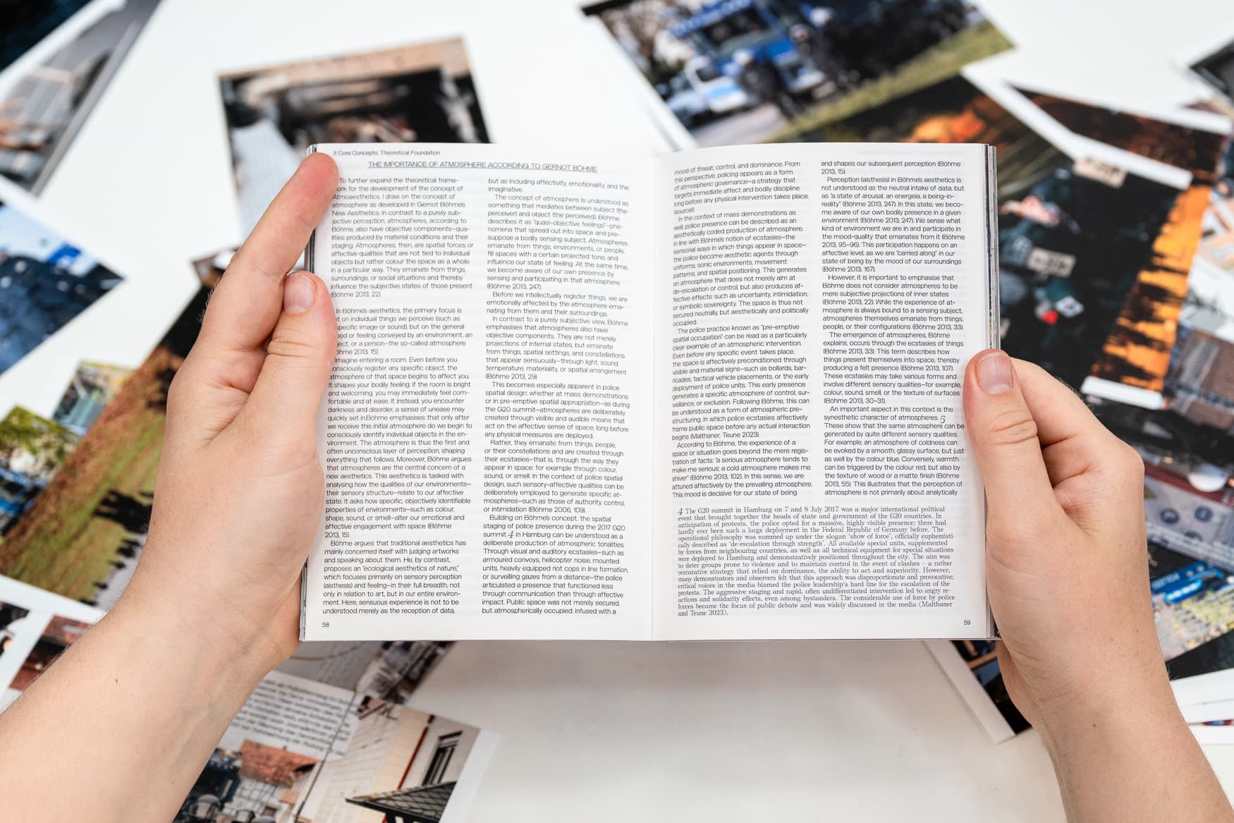 Atmoaesthetics 2 traces the visual strategies of police and their atmospheric impact on public space, grounded in a critical perspective on policing. Taking a design-theoretical lens, the project examines how uniforms, formations, image devices, and choreographed gestures construct affective regimes: moods of threat, control, safety, intimidation. These codes are not merely expressive — they act. As the second iteration of an ongoing investigation, the project builds on the written work Atmoaesthetics 1, continuing and expanding its inquiry through new visual material and a more open, situated format. Presented as a printed publication, it brings together visual research, theoretical reflection, and photographic contributions by Sammy Bermúdez, Jannis Große, Mika Grunwaldt, Timo Knorr, and Mike Schröder (photo collection of Mike Schröder, housed at the Hamburger Institut für Sozialforschung). The publication is conceived as a process and unfolds in a state of becoming: pages arrive unbound, images are recontextualized, and relationships between texts and photographs shift throughout the space. The process remains deliberately open — attentive to proximity, association, and the ways in which meaning emerges between things and through those who engage with it.