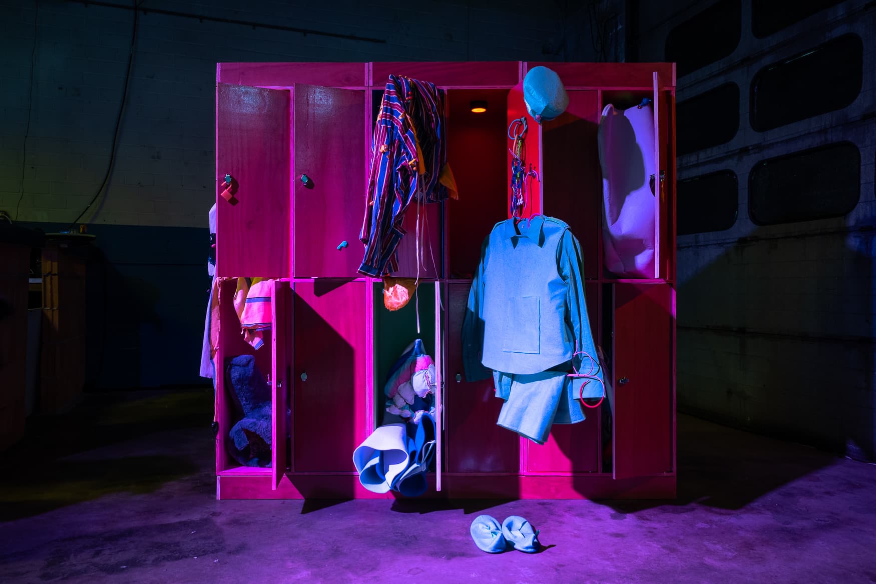 The locker room (I keep spilling), Wood, textile, steel, wax, paint, 180 x 40 x 194 cm Donkey, Cavity, Door Girl, Toothpaste, Snail, and Cow, move through a world that asks too much, moves too fast, and gives too little. These characters do not explain, clarify, or resolve. They mumble, hesitate, repeat. Their incoherence is deliberate, a refusal to comply with a culture obsessed with productivity and rationality. The locker room (I keep spilling) is where they store their clothes and emotional baggage, a transitional space where language spills, emotions linger, and identities blur. It proposes awkwardness, softness and emotional excess not as dysfunctions, but as radical tools for survival and resistance.