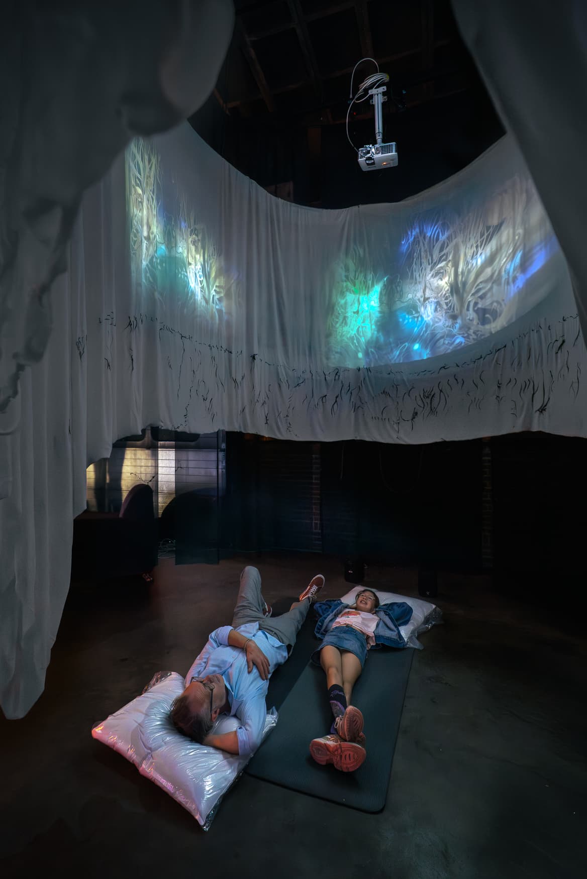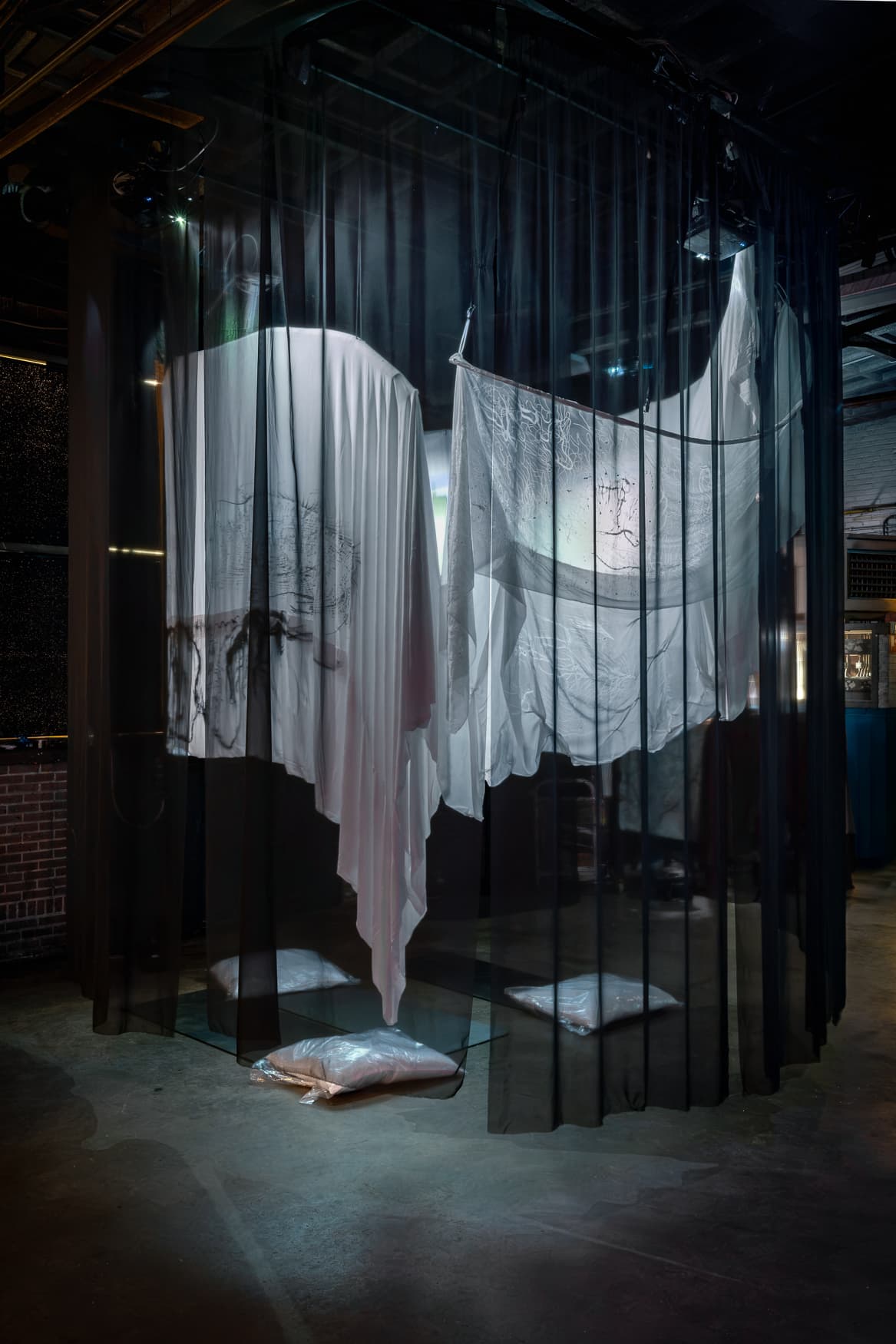 Video, music, silk, steel, wax, plastic, silicon 400 x 400 x 350 cm A cosmic dream brought to life, the story of self discovery, haunted by horrors, delusions and lies. Through an immersive multimedia installation, with a cosmic journey at its core, this piece touches on the ambivalence of escapism and the uncertainty of cultural resistance under the surveillance and control of systems of oppression like capitalism and white supremacy. This story explore how the creatives forces that allow us, even partially, to exist outside of the system, are often, over time, repurposed as tools of its cultural hegemony. The dream-like symbolic, almost cryptic narration of the story, explores the tensions and links between invisibilized marginalized communities, cultural appropriation and also the control and fabrication of our fantasies and dreams by these oppressive structures that seek to pacify and numb us. The light that reaches our eyes is often beautiful and warm but it is never empty, to remember its travel is to remember the connection flowing between all of us.