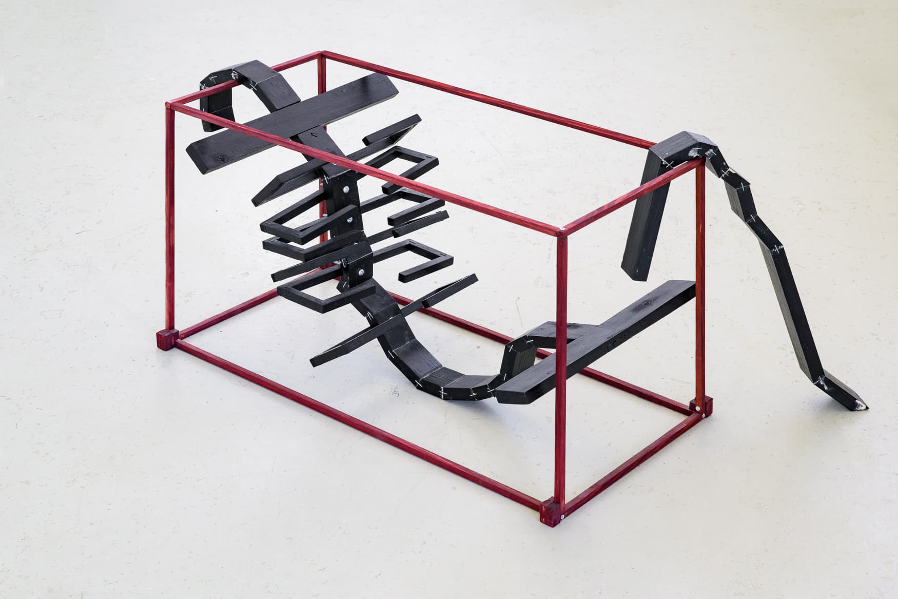…These works are made by trusting a fragmented process, backed up by an attempt to welcome and accept a fragmented posture to lived experiences. Together, they explore the cyclical relationship between transformation, imagination and time in connection to different forms and functions of storytelling. They deal with becoming and forgetting, with animation and arrest, and reflect a human attempt to remember, make sense, and move forward—while acknowledging the confusion, fiction, and fragmentation that inevitably shape the life of any character in question. These works come from a liminal space where imagined fragments of the future are balanced with a partly fictional remembrance of the past. What is known, what is to come and what has already been lost are combined– shown in their scattered state of the present, anticipating the unspent time ahead. .. Modular Torpor consists of a collection of artefacts, yet to be attached to one another, to achieve the ability to move– forwards, backwards or just desperately anywhere at all. The modules represent events of significance in the development of this yet-to-be, scattered character– crucial moments in the evolution of identity and physical embodiment. Through a use of flat materials like wooden boards, the emergence of three-dimensional forms is formed through a slow process. An object is made, another following, not yet knowing if or when to be connected. Through time a character emerges from a void of volume or movement. The sculpture depicts the character’s present form—a collection of past experiences and moments, waiting for what time will reveal as present becomes past and future becomes present. The creature is, just like it’s sturdy material form, dealing with an obstacle of stuck-ness– it’s modules gesturing toward a future self still in the making. The modules do not follow a linear progression but are instead presented as a cluster, a fragmented archive of development stages—crucial memories in the life of a being not yet able to physically continue the quest towards understanding the events that lead to it’s imagined evolution. Presented as a fragmented cluster, these parts resist a linear timeline, echoing how memory forms in disjointed recollections rather than in clear sequence. The trajectory of a life lived thus far is visually represented in this collection of modular objects. The process is methodical, contemplative, and anticipatory; the modules wait to one day unite in motion, to evolve at last together– all experiences finally merged, to complete the next step of their collective becoming. Together, they create an arc– a visual trajectory of a life lived thus far. Flowerpress Experiment (One) uses an almost opposite technique with a contrary function of reducing three dimensional life into an archived, flattened and two-dimensional state. A once living form of life is flattened and fossilised to observe and keep forever. The living thing, placed inside the flowerpress without much thought of consequence, becomes an archive– a moment capturing life at the time of incarceration; the moment where life shifts from mobile consciousness to eternal stillness. The flowerpress was interpreted without reading the instructions. A form of immature science or childish research was implied once the directives were disregarded. The neglected instructions were replaced with human imaginative abilities– it’s potential and it’s limits, affecting both method and outcome. Calculated directions disregarded because of an impatient urge to comprehend. The functional tool was interpreted in solitude without reasonable interference, resulting in something that does not quite make sense. It is like creating a uncomfortable puzzle, where random bits are forced to connect and, after using all the bits available, the resulting image is crooked and broken.