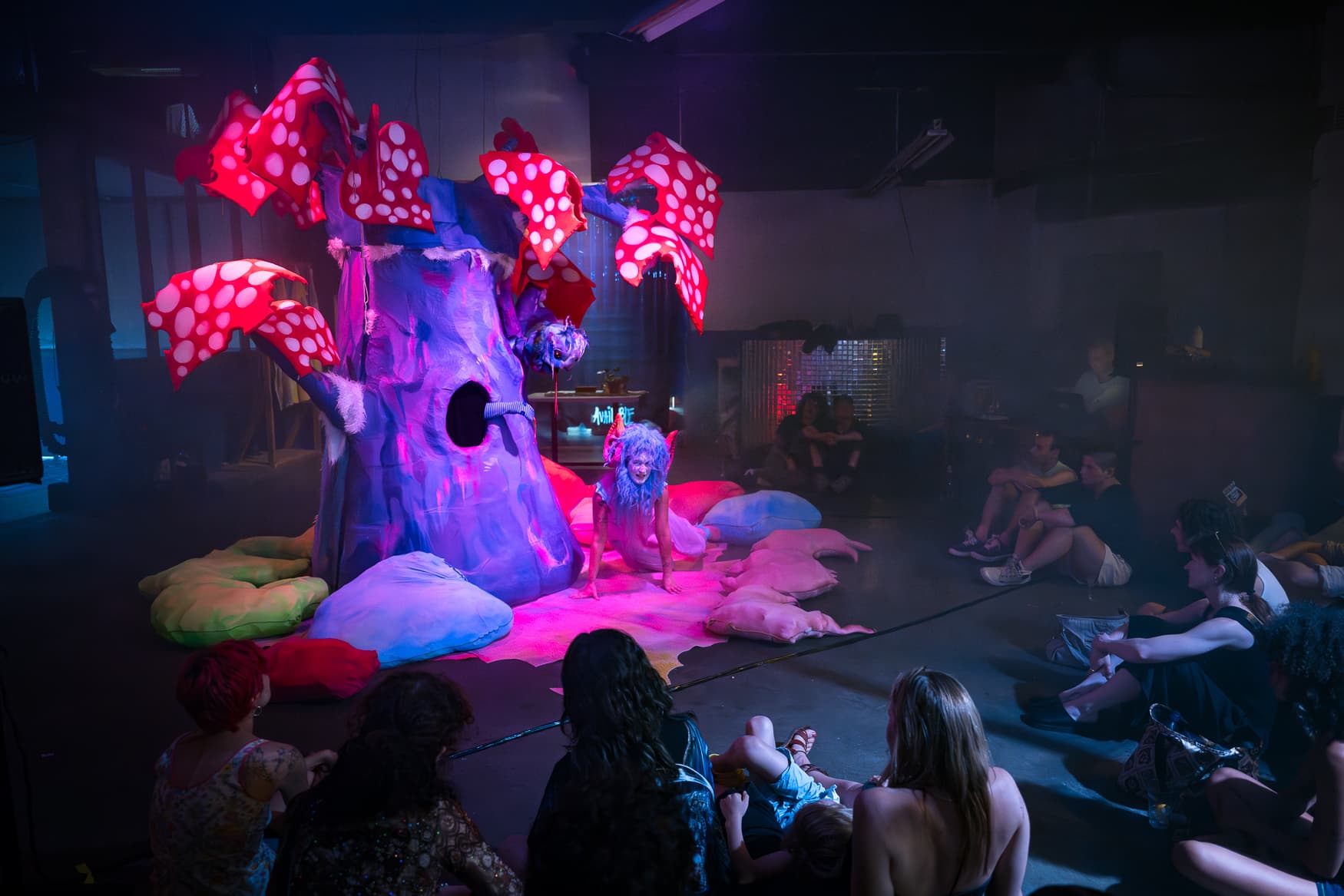 Mondo Fatuo is a short fantastic bedtime story unfolding inside a haunted dream—filled with glowing eyes, croaking creatures and a life-giving tree. Blending fictional worldbuilding, theater and puppetry techniques and brought to life collectively through collaboration with other artists—the performance presents a dreamlike scenario in which a spooky woodworm and a young girl talk about the urgency of recovering our childhood, our identities and our right to play as a critique of today’s capitalist-driven and individualistic society. "For fantasy is true, of course. It isn’t factual, but it is true. Children know that. Adults know it too, and that is precisely why many of them are afraid of fantasy. They know that its truth challenges, even threatens, all that is false, all that is phony, unnecessary, and trivial in the life they have let themselves be forced into living. They are afraid of dragons because they are afraid of freedom. So I believe we should trust our children." Ursula K.Le Guin