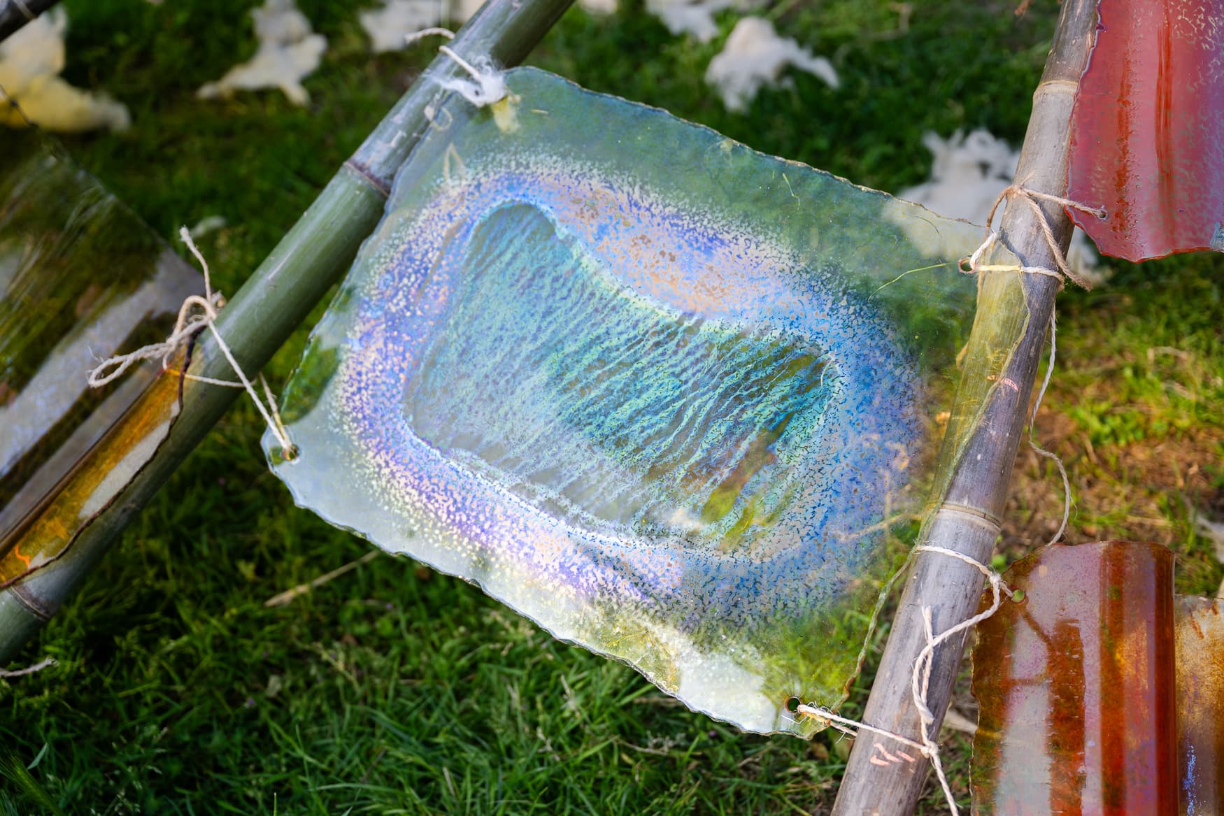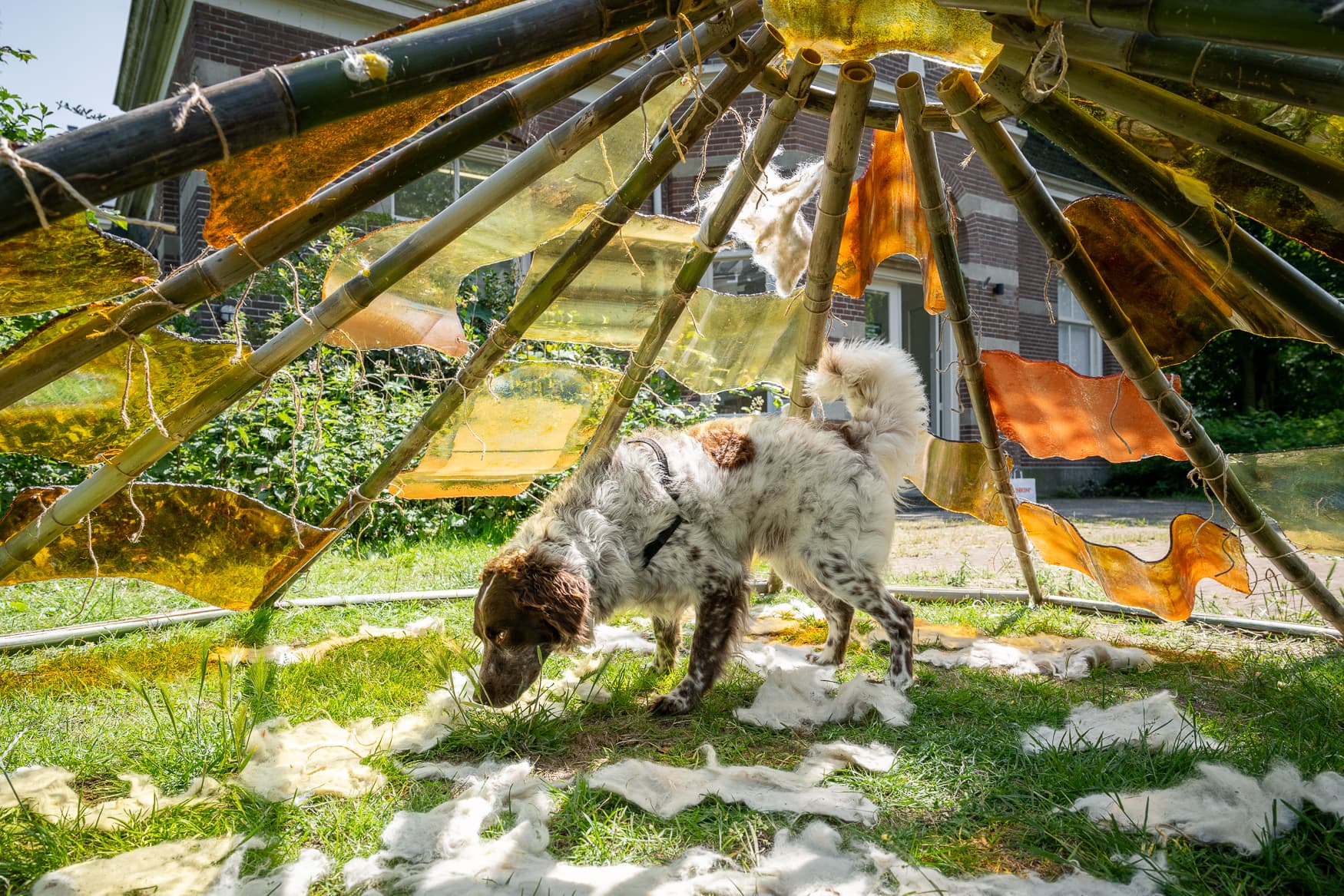 Eiros, Clara & Saïdi Deltort "The Husk" is a structure of grief built for one dog and one human. It’s a space of shared mourning and multispecies intimacy, dedicated to Eiros, Clara’s late companion, a Spanish water dog whose presence continues to shape her work even in absence. Constructed from bamboo, the sculpture first emerged as a shelter for dogs, then evolved to accommodate humans echoing the entangled lives and shared spaces we create with our animal kin. Its form invites to rest, stillness and a mutual gaze between species. Installed outdoors, it responds to the sun and the body. When lying down within it, the world is filtered through yellow a color perceptible to both humans and dogs. This shifting light becomes a shared lens, a tender hallucination of grief. The dome is tiled with hand-cut, slumped, and pigmented glass, using a yellow silver stain, a medieval technique once used in ecclesiastical windows and alchemical symbols of the divine. Silver compounds, when fired into glass, produce luminous golden hues transfiguring light into meaning. Here, that same process is recast as a language of mourning. The yellow tiles become both relic and ritual: filtering time, heat, and the chemical memory of light. Some tiles are bound to the bamboo with rope felted from Eiros’s hair; others are made entirely from his felt. These elements physical traces, binding material,memory and smell. After a year of collaboration with a chemist and a perfumer, Eiros’s specific odor, his molecular signature, has being reconstructed. The smell will slowly enter the space, inviting both dogs and humans to confront the haunting presence of a body no longer here. A husk is what remains when the living core has departed: the shell, the skin, the cast-off sheath. In mythology and mysticism, the husk marks the threshold between spirit and matter, a vessel once inhabited, now emptied, yet still echoing with memory. In this work, "The Husk" becomes both literal and symbolic: a shelter shaped by love and loss, where absence finds form.
