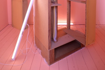 In’ Making a Living’ Hoonhout produced a sculptural situation that opens up a reflection around the constructed nature of a private space, a home, and the narrative imposed by mass production. By using the character of the commercial window display and different points of view from the ‘inside-and-outside’, she sets up a narration that deals with the depicted new object and the active used object. On different levels the work questions authenticity and our physical connection to our own living spaces.