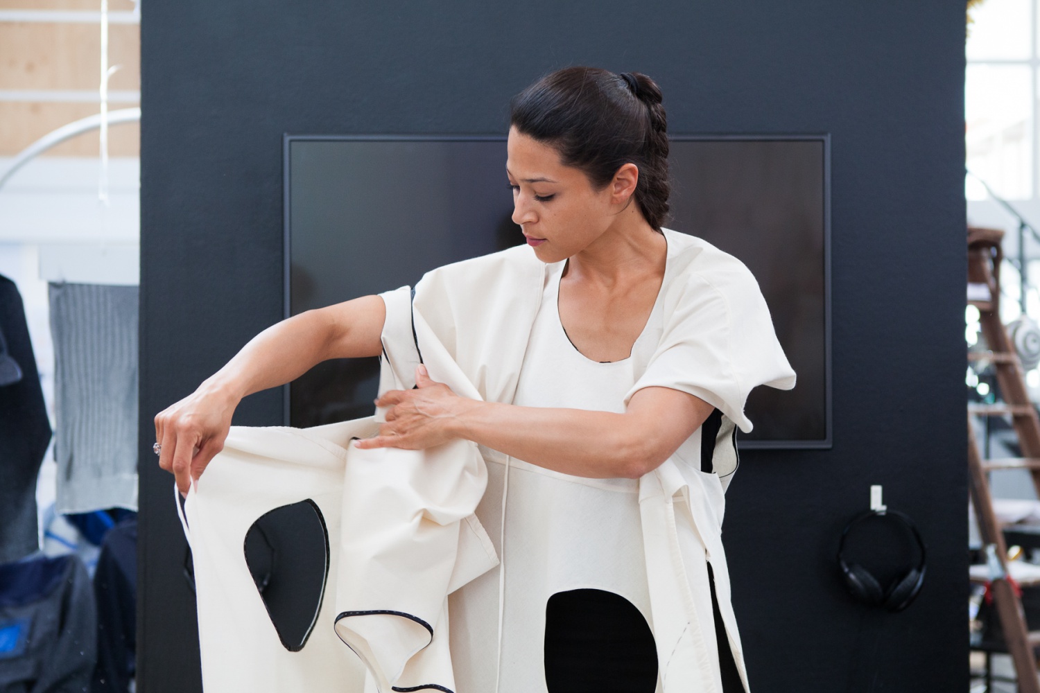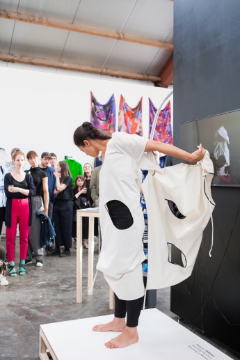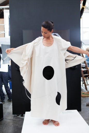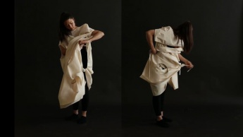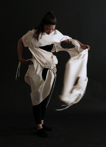 Margret Wibmer's video 'Infinite Play' reflects on the intimate act of dressing. Garment and wearer are involved in a fluid conversation through the folding and unfolding of the garment. "Each movement is a proposal. There is nothing fixed, nothing right or wrong. Rathing than aiming at a final form, the performance of the garment stimulates the imagination of both performer and spectator."
