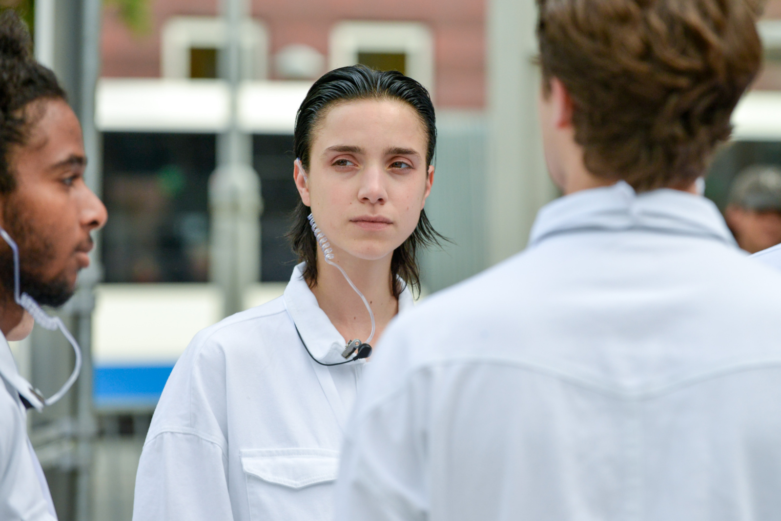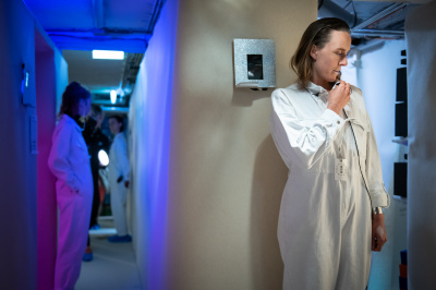 For her work on ‘capitalist sorcery’, Merkel examined experience marketing as designed ritual to detect loopholes for ‘breaking the spell’. She developed site-specific choreographies for 12 performers, which act as collective body, appearing unsolicited to invade spaces for supervision. Interlinked with radio units, they move through illegible codes while whispering detailed descriptions. Sometimes individuals break free to reclaim personal agency only to fall back into the corporate ritual.